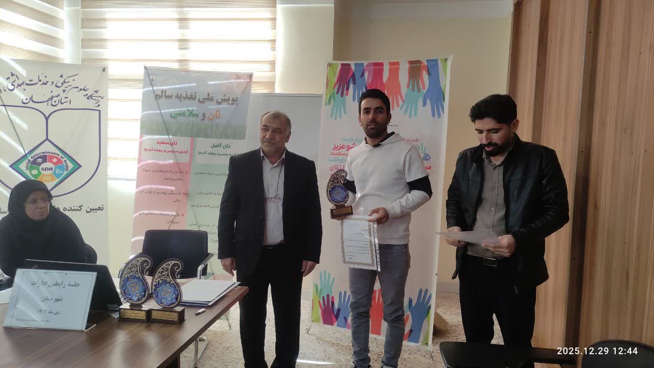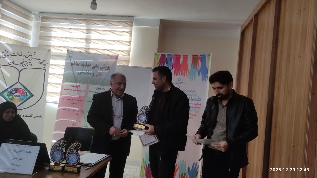 در این جلسه معاون محترم شبکه بهداشت و درمان ضمن تبریک هفته جهانی داوطلب و تشکر از فعالیت رابطین سلامت ادارت ، مباحثی پیرامون برنامه SDH و آشنایی با طرح پاد ارائه و در ادامه مسئول واحد امور پزشکان و مسئول واحد تغذیه به ترتیب مطالبی در خصوص پیشگیری از بیماری دیابت و اهمیت مصرف نان کامل به مناسبت پویش ملی تغذیه سالم با موضوع "نان و سلامت " توضیحاتی ارائه نمودند سپس مسئول واحد آموزش سلامت و واحد سلامت روان شبکه در خصوص برنامه خودمراقبتی سازمانی، نتایج نیازسنجی ادارات( بعد سلامت شغلی) و هماهنگی جهت اجرای مداخلات آموزشی در ادارات مجری توضیحات لازم را ارائه نمودند ، در پایان به مناسبت گرامیداشت هفته جهانی داوطلب از رابطین سلامت ادارات منتخب با اهدای لوح تقدیر تجلیل شد.